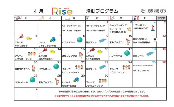 2026年2月12日月間スケジュール(activeRise)Rise-hensyu activeRise.R8.4月間プログラムこんにちは! ✨児童デイサービスactiveRiseです✨ 👏令和8年4月の月間活動プログラムのお知らせです👏 更新が遅くなってしまい申し訳ございません。 新学期が始まり、心機一転!元気に活動していきます🙌
