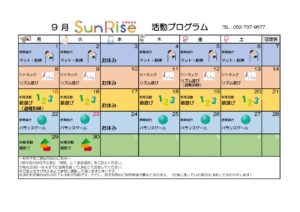 2025年7月12日 / 最終更新日 : 2025年7月12日 Rise-hensyu 月間スケジュール(Rise) Rise R7.9月のプログラム こんにちは!放課後等デイサービスRiseです🌈 令和7年9月の月間活動プログラムのお知らせです☆ 敬老の日には、高齢者施設の方との交流会を計画中です♪ また、土曜日には、前回雨天で中止となった愛知牧場へのリベンジをしたいと考えております!! Follow me!