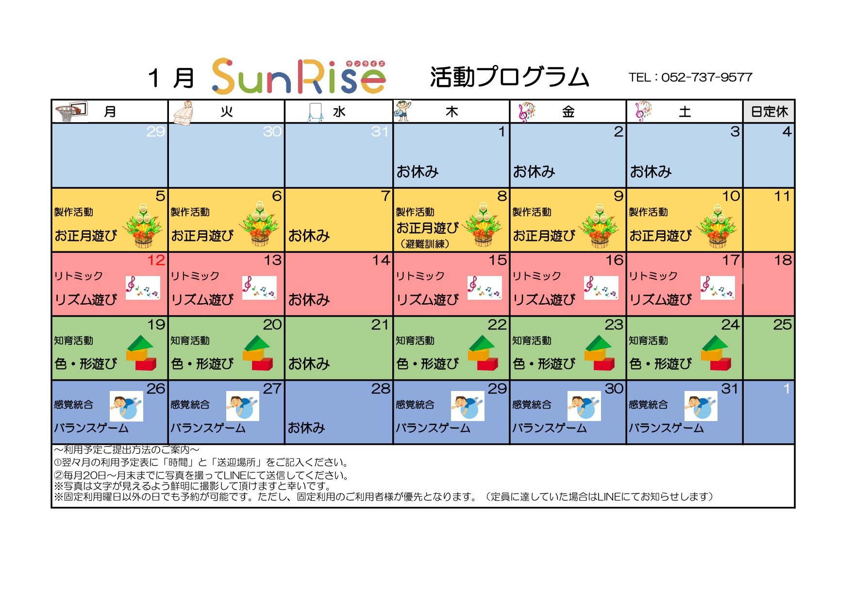 2025年11月14日 / 最終更新日 : 2025年11月14日 Rise-hensyu 月間スケジュール(SunRise) SunRise R8.1月 月間活動プログラム こんにちは!児童発達支援SunRiseです(^O^)/ 令和8年1月の月間活動プログラムのお知らせです☆彡 Follow me!