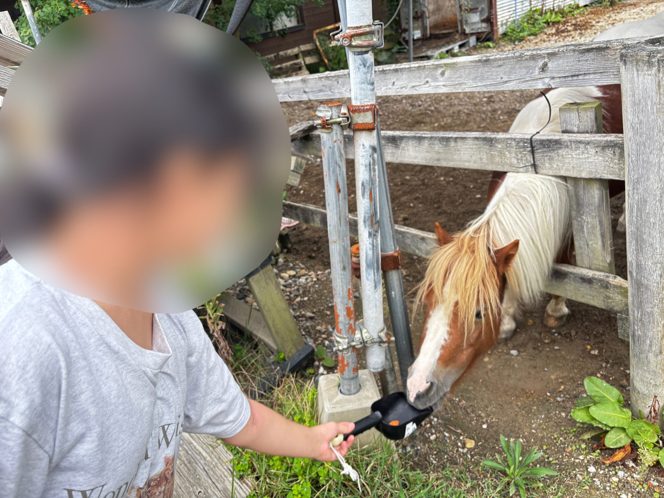 入り口の馬に興味津々!エサやりが出来るとの事で、1人ずつスコップで人参をあげました!