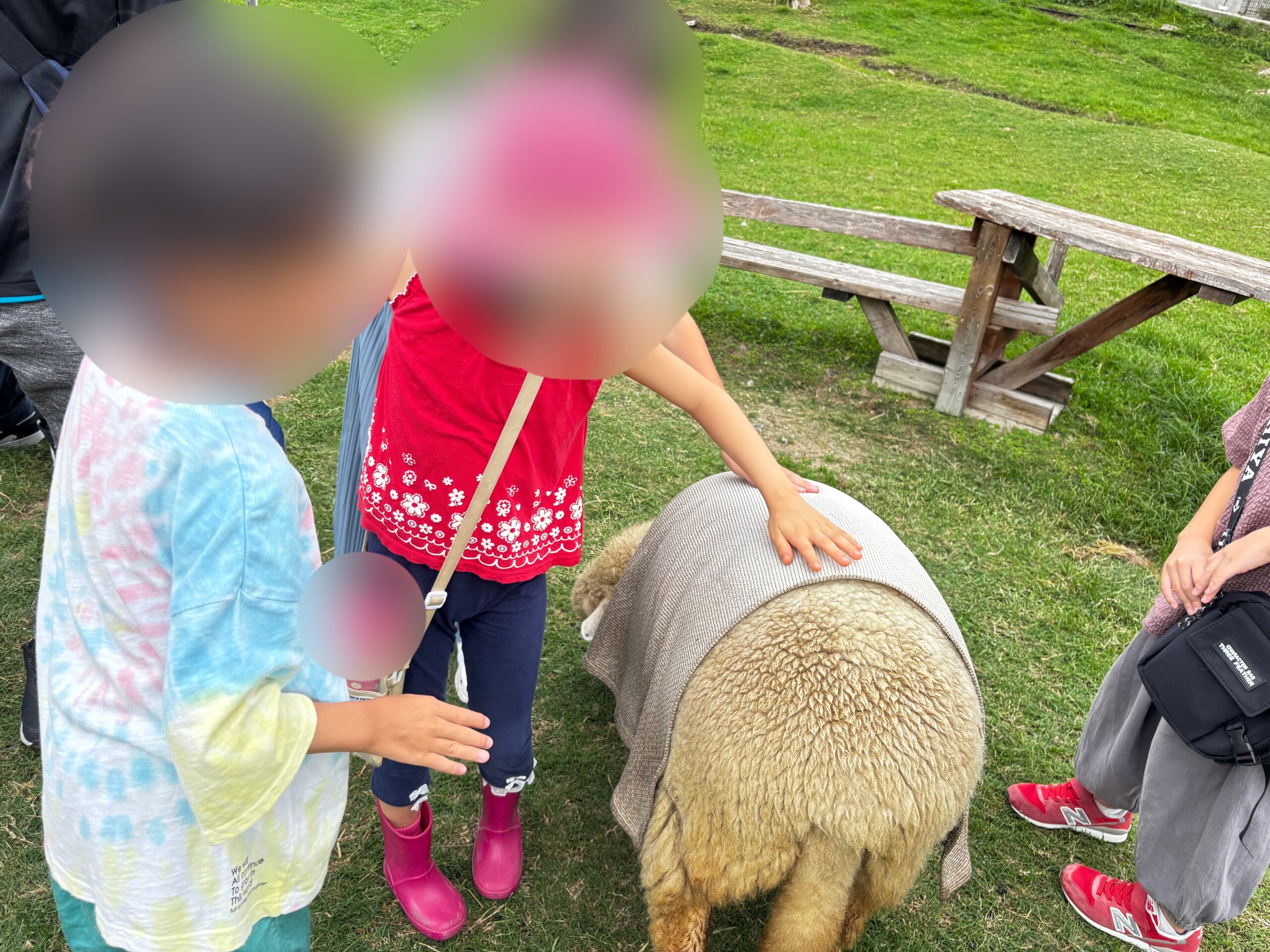 動物を見て「くさい~。」と言っている子や、突然近寄ってきた羊にびっくりしていた子も、