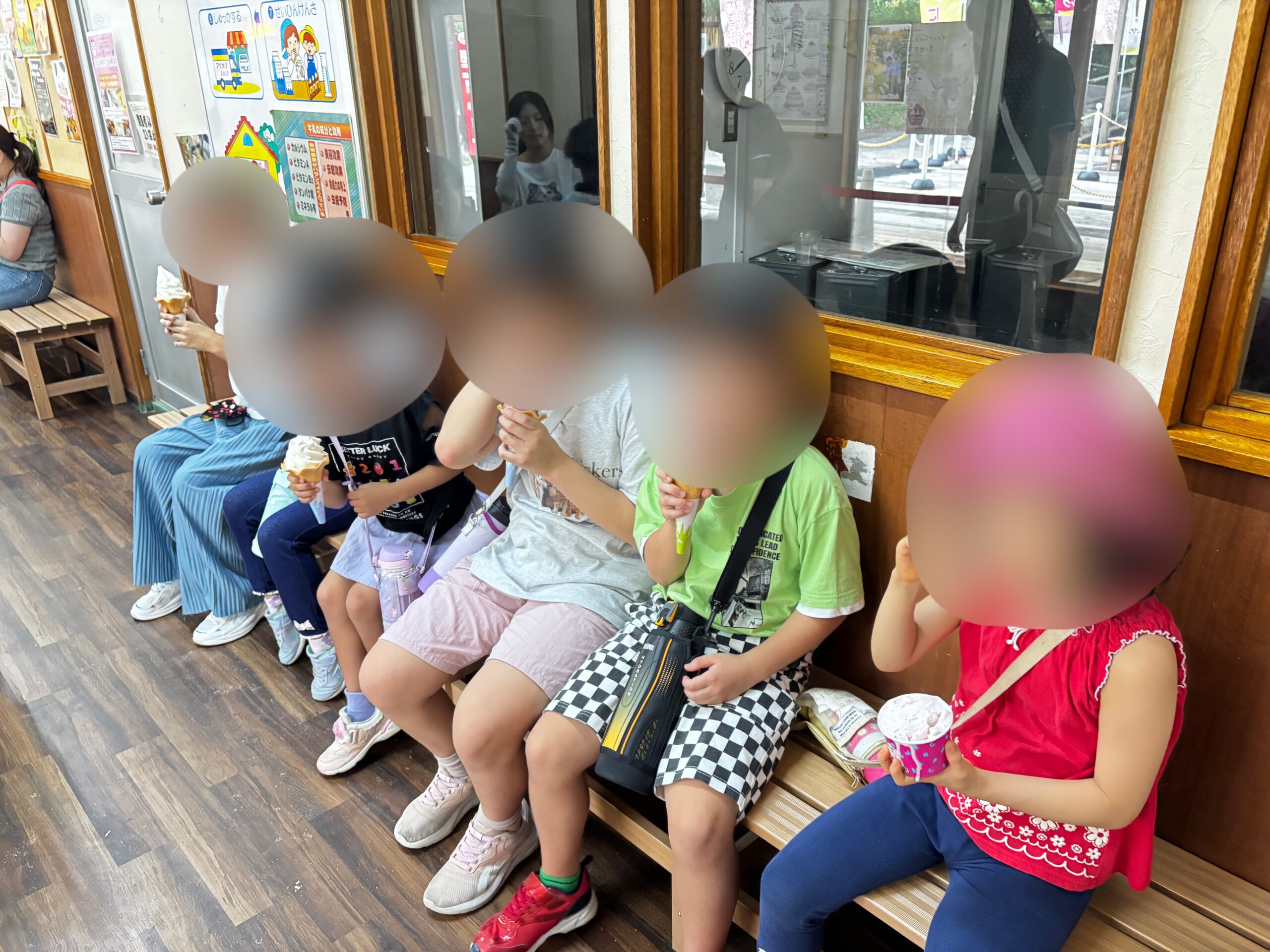 みんなで椅子に座ってジェラートやソフトクリームを食べました(^^)