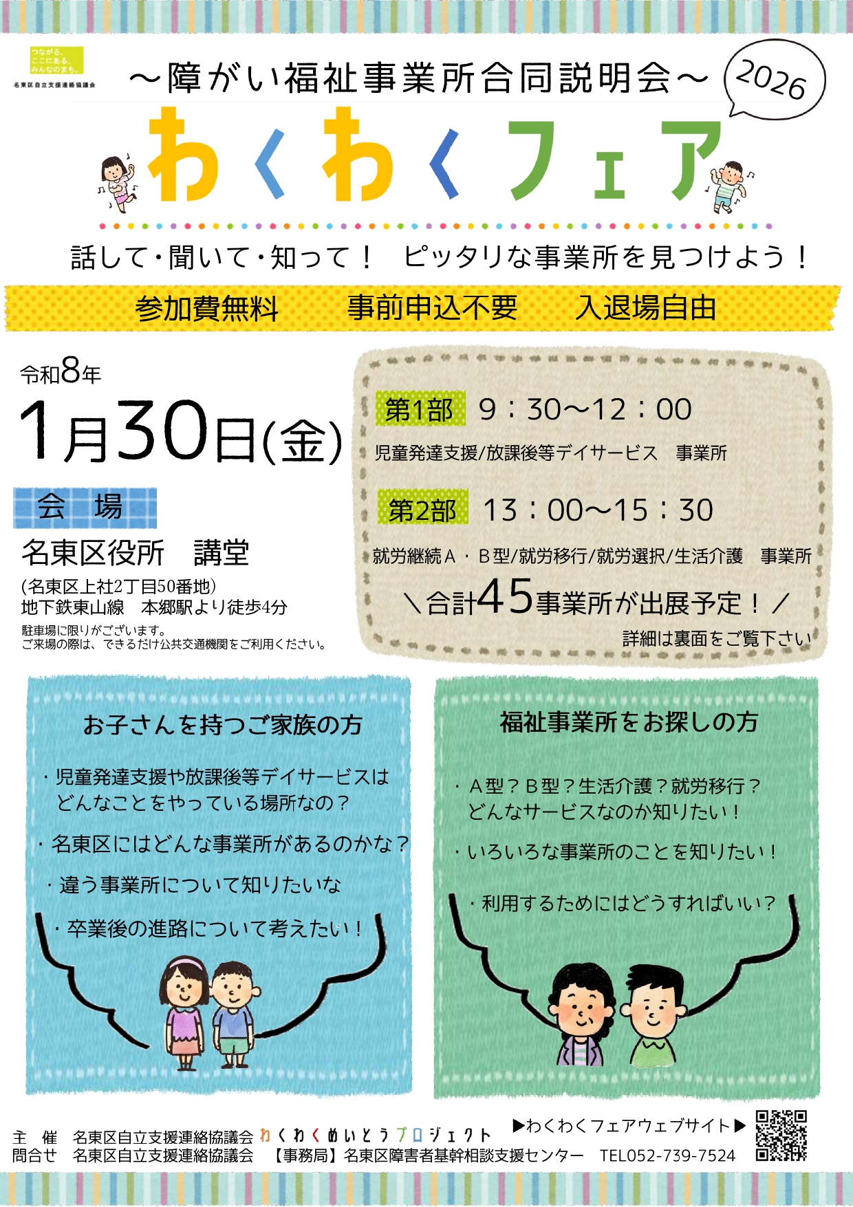 2026年1月30日(金)に名東区役所にて、【わくわくフェア〜障害福祉事業所合同説明会〜】が開催されます‼️