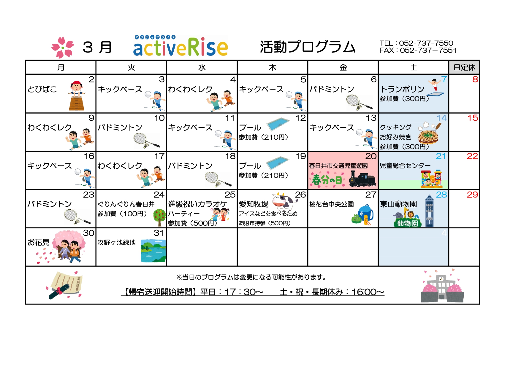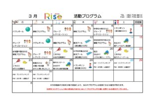 2026年1月13日 / 最終更新日 : 2026年1月13日 Rise-hensyu 月間スケジュール(activeRise) activeRise R8.3月月間プログラム こんにちは! ✨児童デイサービスactiveRiseです✨ 👏令和8年3月の月間活動プログラムのお知らせです👏 更新が遅くなってしまい申し訳ございません。 まだまだ寒い日が続きますが引き続き元気に活動していきます🙌 Follow me!