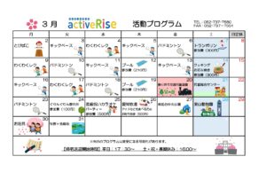 2026年1月15日 / 最終更新日 : 2026年1月19日 Rise-hensyu 月間スケジュール(SunRise) SunRise R8.3月 月間活動プログラム こんにちは!児童発達支援SunRiseです(^O^)/ 令和8年3月の月間活動プログラムのお知らせです☆彡 Follow me!