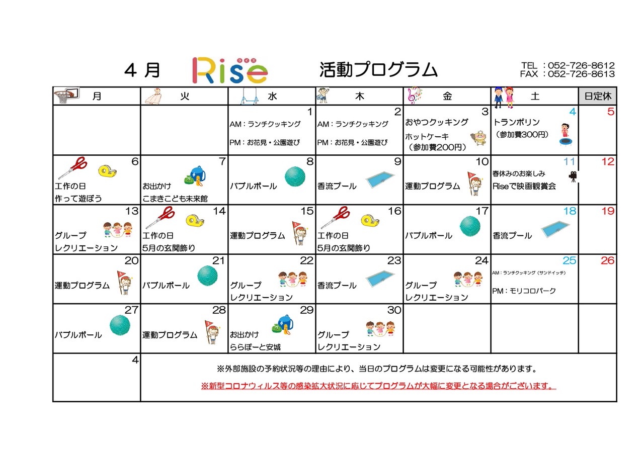 2026年3月19日 / 最終更新日 : 2026年3月19日 Rise-hensyu 月間スケジュール(Rise) Rise R8.4のプログラム いつもお世話になっております! 放課後等デイサービスRiseです🌈 令和8年4月の月間活動プログラムを公開します!! 4月は新学期ということもあり、Riseでゆっくりと過ごせるプログラムを予定しています。 その中でも、工作やクッキング、お出かけなど楽しめる内容を計画中です❤ Follow me!