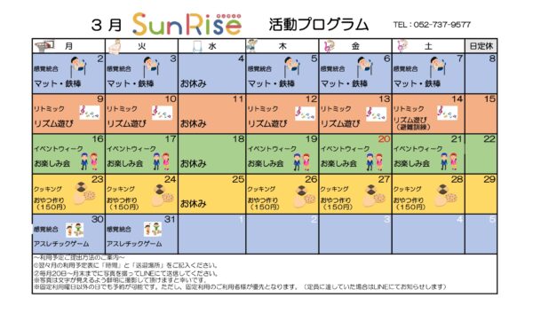 2026年1月15日月間スケジュール(SunRise)Rise-hensyu SunRise R8.3月 月間活動プログラムこんにちは!児童発達支援SunRiseです(^O^)/ 令和8年3月の月間活動プログラムのお知らせです☆彡
