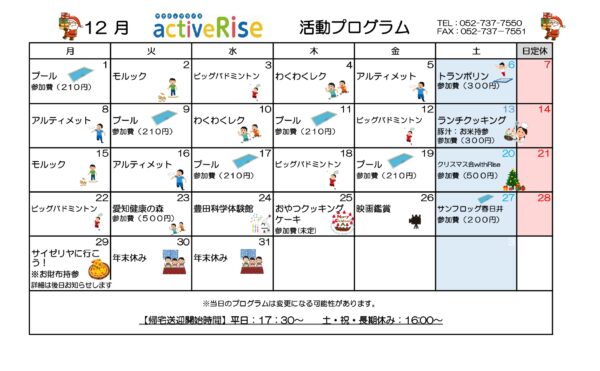 2025年10月10日月間スケジュール(activeRise)Rise-hensyu activeRise R7.12月月間プログラムこんにちは! ✨児童デイサービスactiveRiseです✨ 👏令和7年12月の月間活動プログラムのお知らせです👏 寒さの負けずに職員も熱い気持ちで体調管理を頑張ります🔥